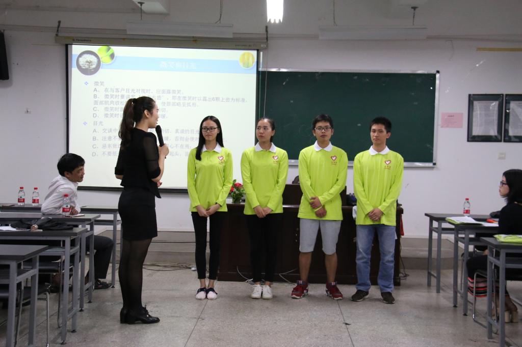 李少华老师在辅导伊始先强调了志愿活动的意义和重要性,并对大家积极踊跃报名志愿者、参加志愿者选拔的行为表示了肯定,表扬了大家的志愿服务精神。韩部长随后为在场志愿者介绍了国际山水文化旅游节的基本情况,说明了志愿工作的性质和内容,也为大家说明了一下培训的流程和内容。紧接着,拥有国家礼仪培训师资格的詹佳佳老师为大家进行了详细的礼仪培训课程。詹老师从大家的仪容仪表说起,为大家担任志愿者期间的言谈举止提出了不少改进意见。詹老师的讲课生动风趣,与大家互动频仍,受到预备志愿者们的一致好评。