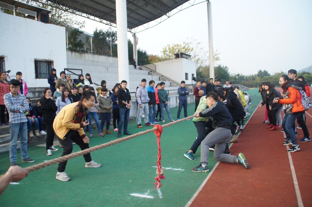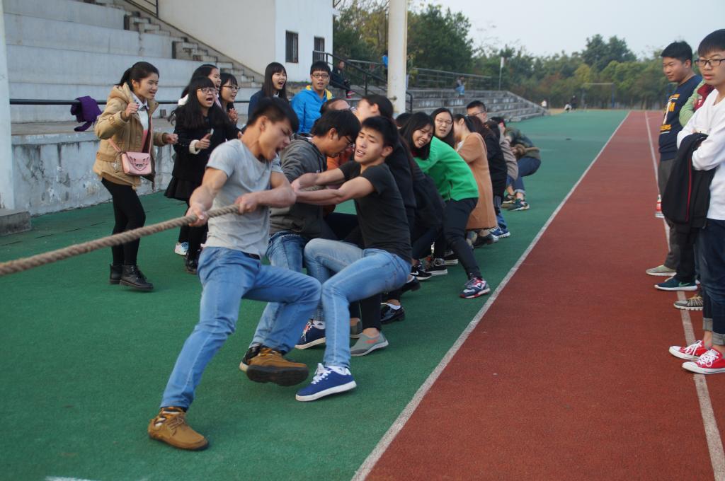 当比赛的哨声一响起,参赛队员们使出浑身力气把绳子向后拉,绳子中间的红线左右摇摆。两边队员都整齐地往后倒、向后退,辅导员们也在队伍旁边助阵加油,啦啦队此时竭力大喊“加油”号子声、呐喊声,此起彼伏,飘荡在整个运动场的上空。经过激烈的角逐,风景15—1班荣获此次拔河比赛的冠军,旅管15—4班获得亚军,旅管15—5班获得季军。