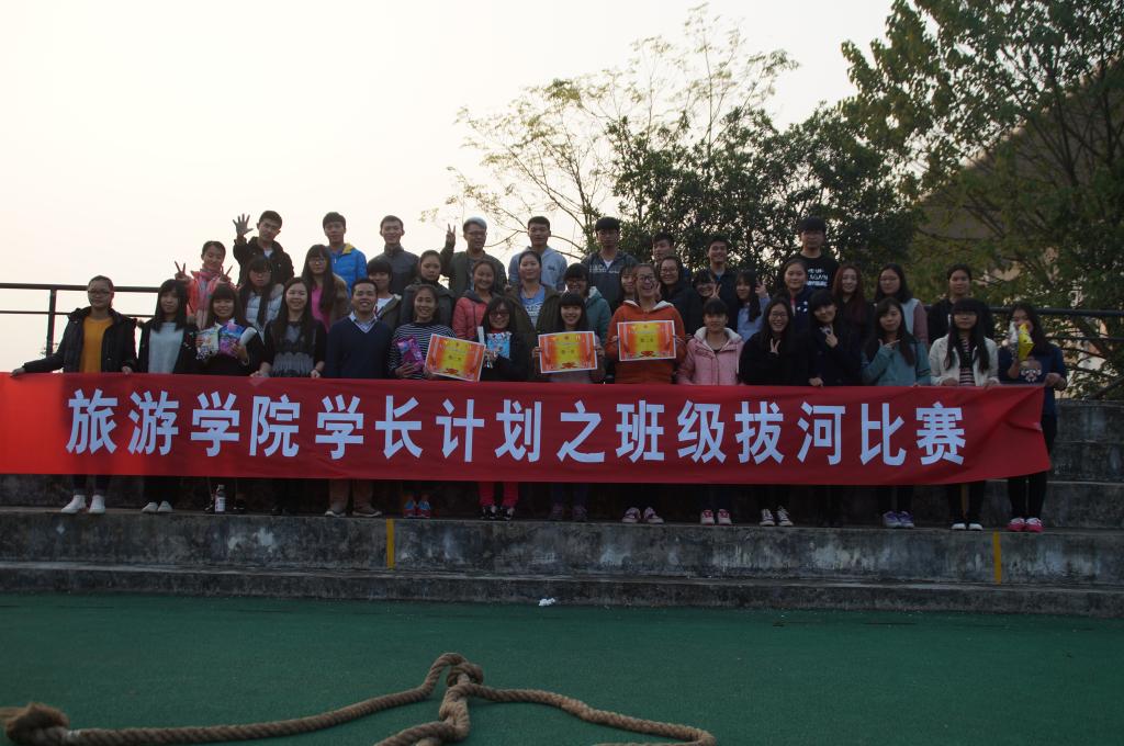 为了丰富同学们的课余文化生活,增进同学之间的交流,培养团队协作能力,结合学校学风建设月活动的开展。12月27日,旅游学院学长组全体成员召集15级新生,在风雨操场举办了一场别开生面的拔河比赛。15级辅导员黄小华、梁文宏(挂职)也到比赛现场给同学们加油鼓劲。