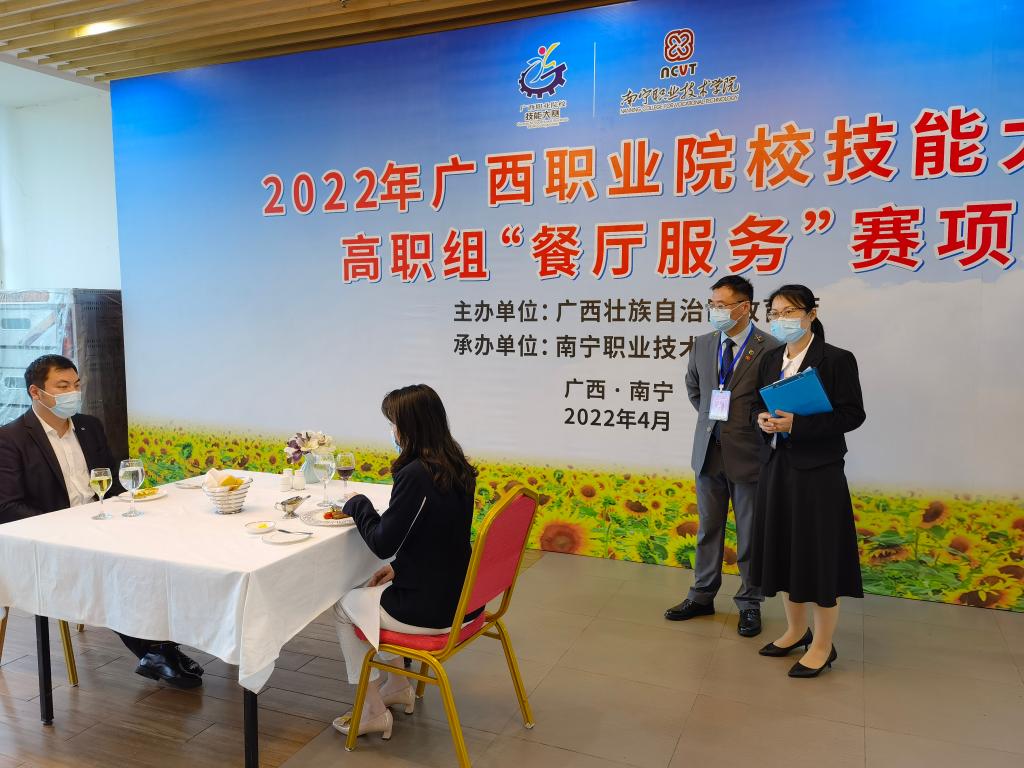 beats365亚洲版教师邓敏教授应邀参加广西职业院校技能大赛高职组《餐厅服务》赛项执赛工作。该赛项由广西壮族自治区教育厅主办,南宁职业技术学院承办,于2022年4月17—18日,在南宁职业技术学院金葵酒店举办。该赛项由中餐服务和西餐服务两部分内容组成,其中中餐服务分比赛为主题宴会设计、宴会服务两个模块;西餐服务比赛内容分为鸡尾酒调制与服务、休闲餐厅服务两个模块。此次比赛全区共15所职业院校的60名选手参加比赛。四个模块的比赛都达到了预期目标,参赛选手的作品档次明显提高;主题创意不断升级;布草选择、服务动作,中餐宴会设计整体造型和色彩提升一个层次,选手整体表现较好不仅仅展示了中餐宴会设计、宴会服务、鸡尾酒调制与服务、休闲餐厅服务等四大模块的技能,更是锻炼了他们的旅游专业素养的综合实操能力和实践运用能力。